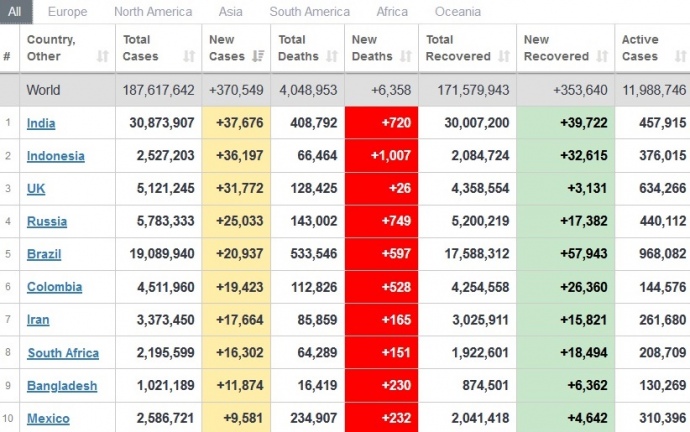 Деталі: Зокрема, в Індії зафіксували понад 37 тисяч нових інфікувань, в Індонезії – понад 36 тисяч, а у Британії – понад 31 тисячу випадків.
