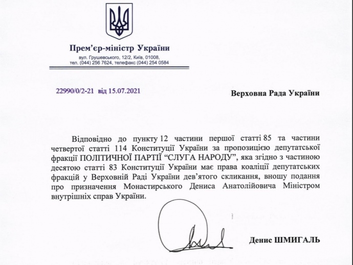 Прем’єр-міністр Денис Шмигаль вніс кандидатуру народного депутата Дениса Монастирського на посаду голови Міністерства внутрішніх справ.
