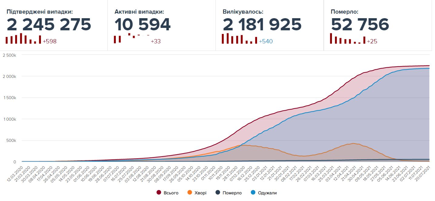 За добу 19 липня в Україні зафіксовано 598 нових підтверджених випадків COVID-19, госпіталізовано з діагнозом чи підозрою на коронавірусну хворобу 279 осіб, померли 25 хворих, одужали 540 осіб;