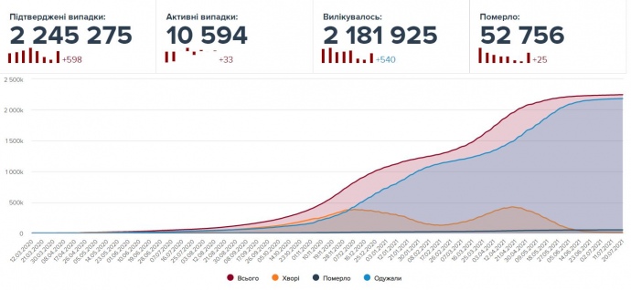 За весь час пандемії в Україні коронавірус виявили у 2 245 275 осіб, із них 2 181 925 осіб одужали, 52 756 осіб померли.