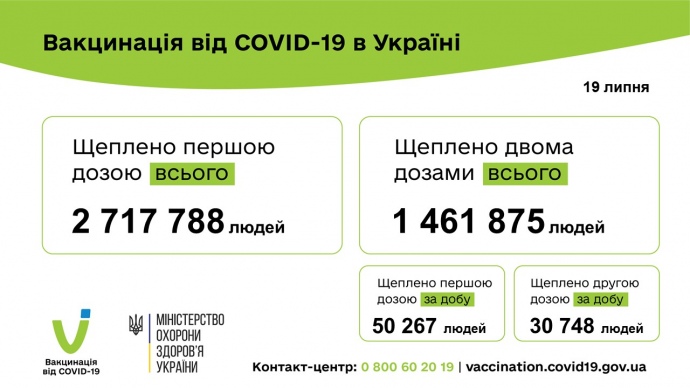 19 липня 50 тисяч українців отримали першу дозу вакцини, 30 тисяч – другу