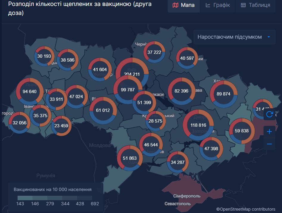 Лідером за кількістю щеплень і першою, і другою дозами є столиця Київ.