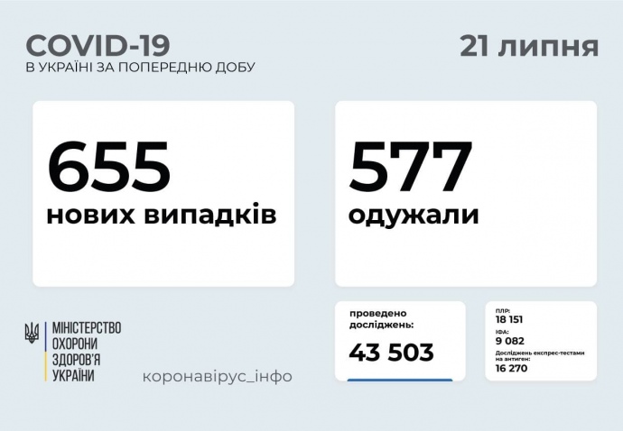 За добу 20 липня в Україні зафіксували 655 нових випадків COVID-19, серед них летальних – 13.