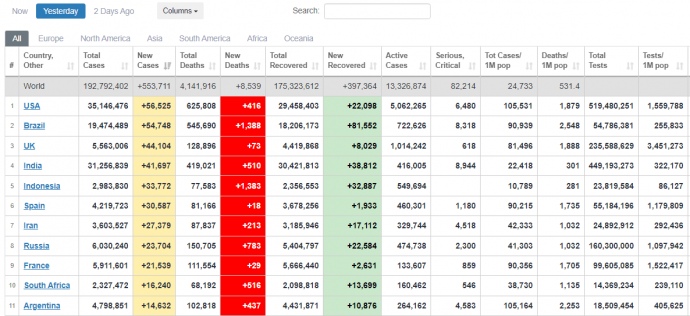 За добу 20 липня у світі зафіксували 553 711 нових заражень COVID-19.