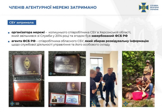 Співробітники контррозвідки, внутрішньої безпеки та слідчі Служби безпеки України викрили та припинили діяльність агентурної мережі ФСБ РФ, яка діяла на території Херсонської області.