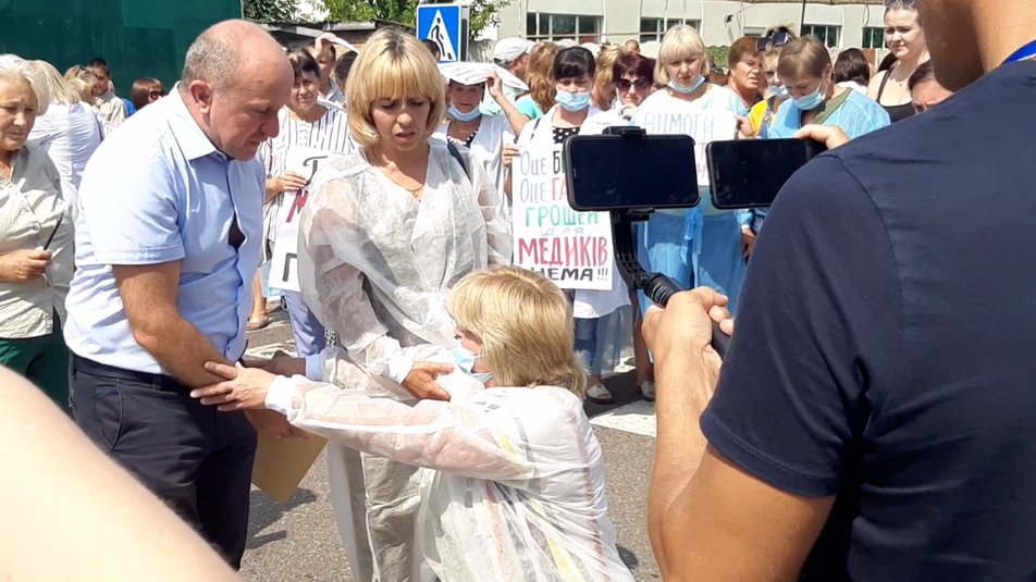 Під час акції медсестра Олександра Дуденкова, вимагаючи виплат, падала на коліна перед посадовцями. Один з чиновників її підняв.