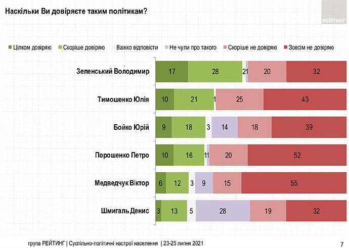 Дослівно: "Рейтинг довіри до політиків очолює Володимир Зеленський, якому довіряють 45% опитаних, не довіряють – 52%. Юлії Тимошенко довіряють 31%, не довіряють – 68%".
