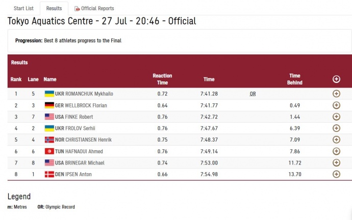 Деталі: Романчук виграв півфінал на дистанції 800 метрів із результатом 7.41.28. Таким чином, він встановив Олімпійський та національний рекорд.