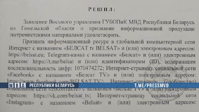 Дослівно МВС Білорусі: "Інформаційні ресурси "Белсат" визнані екстремістськими. Таке рішення прийнято 27 липня судом Залізничного району Гомеля".
