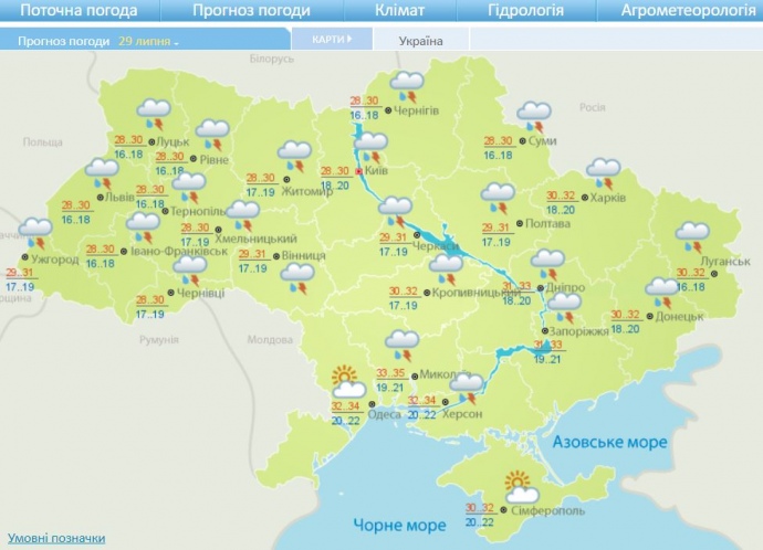 У четвер в Україні передбачаються повсюди періодичні дощі, а температура повітря коливатиметься в межах +29+34 градусів.