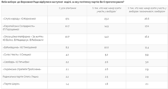 Партію "Сила і честь" підтримують відповідно 4% і 6%, ВО "Свобода" ˗ відповідно 2% і 3%, партію "Українська стратегія Гройсмана" ˗ відповідно 2% і 3%, Радикальну партію Олега Ляшка ˗ відповідно 2% і 3%, "Партію Шарія" ˗ відповідно 1% і 2%.