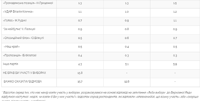За партію "Громадянська позиція" виступають відповідно 1% і 1,5%, партію "УДАР Віталія Кличка" підтримують 1% і 1%, партію "Голос" ˗ відповідно 1% і 1%, партію "За майбутнє" ˗ відповідно 1% і 1%, партію "Опозиційний блок" ˗ відповідно 0,5% і 1%, партію "Наш край" ˗ відповідно 0,5% і 0,5%, партію "Пропозиція" ˗ відповідно 0,4% і 0,3%.