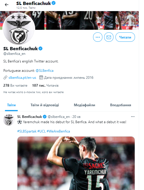 Футбольний клуб "Бенфіка" перейменував свою сторінку у Twitter на честь українського футболіста Романа Яремчука, завдяки якому команда перемогла московський "Спартак" – сторінка тепер носить назву SL Benficachuk.