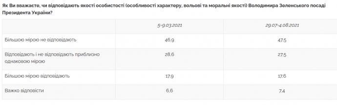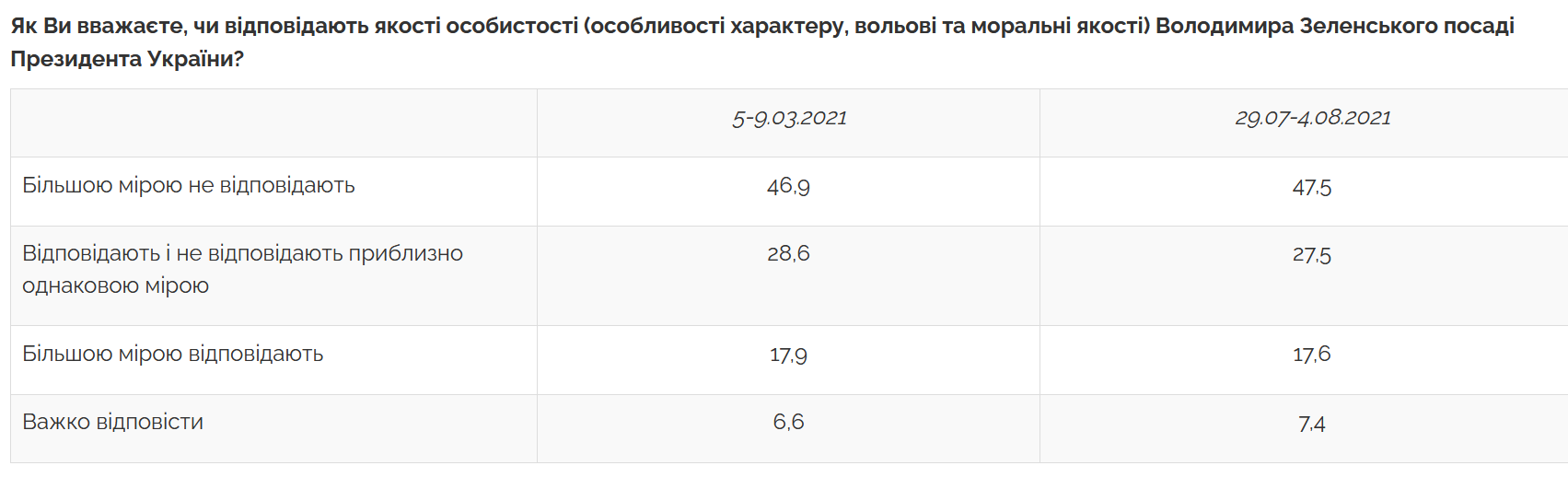 Крім того, 47,5% респондентів вважають, що якості особистості (особливості характеру, вольові та моральні якості) Зеленського більшою мірою не відповідають посаді президента, 17,6% вважають, що відповідають, а 27,5% − що відповідають і не відповідають однаковою мірою.