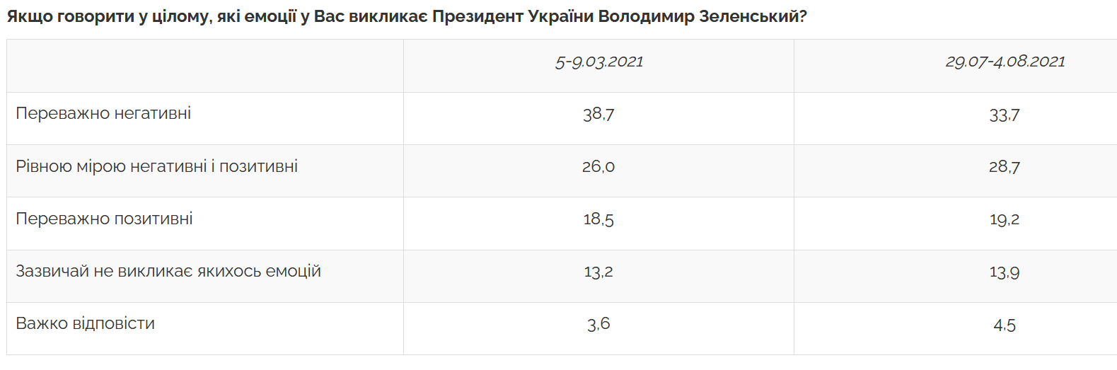 Стосовно емоційної оцінки, то 33,7% респондентів заявили, що Зеленський викликає у них переважно негативні емоції, 19,2% ˗ переважно позитивні, 28,7% ˗ рівною мірою негативні і позитивні, 13,9% ˗ не викликає якихось емоцій.
