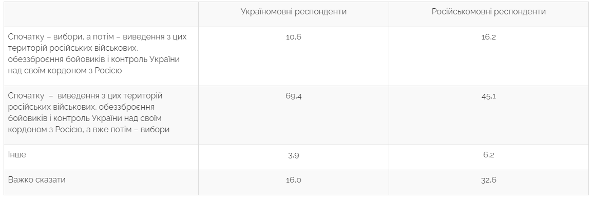 Вважають, що спочатку повинно відбутися виведення російських військових, а вже потім ˗ вибори, більшість респондентів у Західному (83%), Центральному (64%) і Південному (56%) регіонах і відносна більшість ˗ у Східному (35%, при 26% тих, хто дотримується протилежної точки зору).