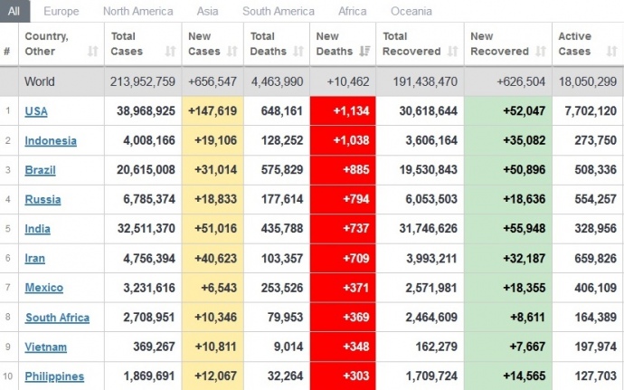 За весь час пандемії вилікувались від недуги 191 485 881 особа. Наразі нараховується майже 18 млн активних випадків захворювання.