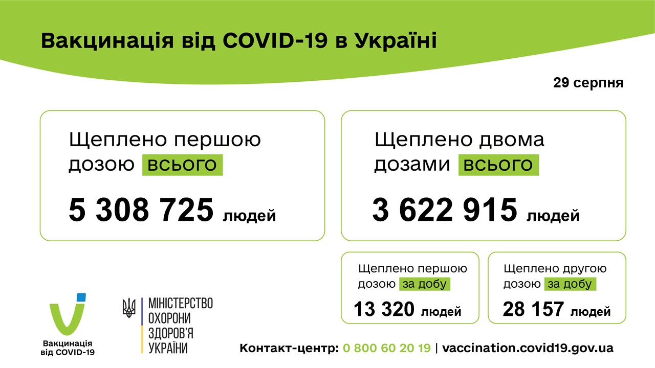 У неділю 29 серпня 41 477 людей вакцинували проти COVID-19 в Україні: першу дозу вакцини отримали 13 320 людей, другу дозу – 28 157 людей.