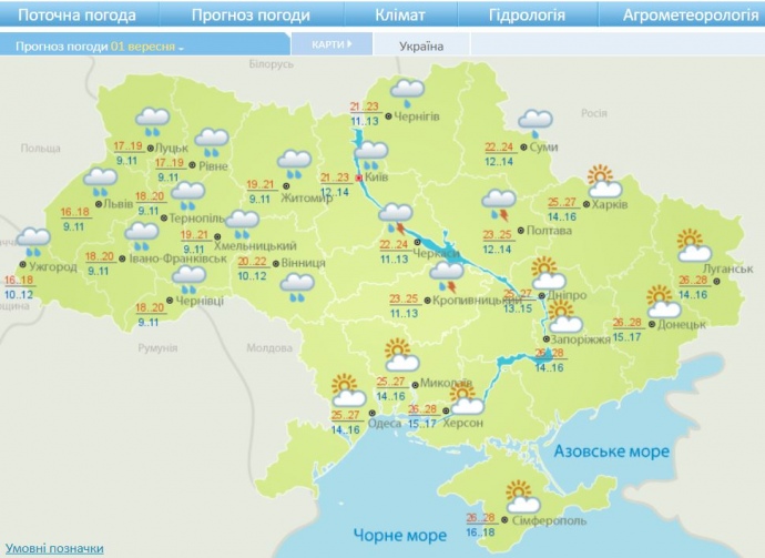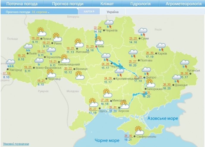 Деталі: 31-го серпня на заході прогнозують +17+22, на Півночі +19+24, на сході, півдні, у більшості центральних областей +23+28 градусів.