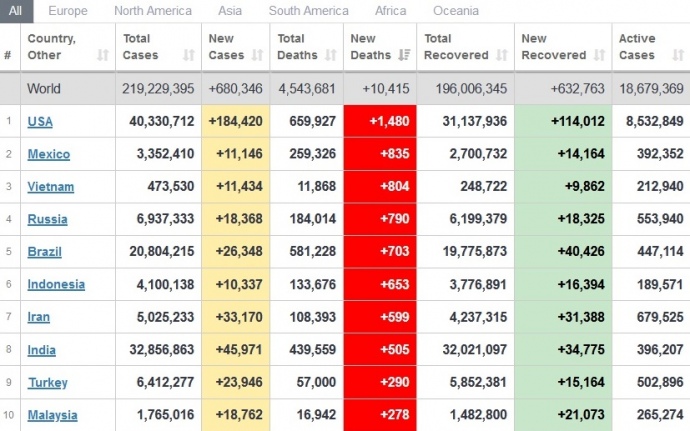З початку пандемії підтверджено 4 545 159 смертей від COVID-19.