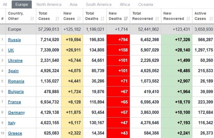 В Європі за добовим приростом хвороби лідирують Британія, Росія, Німеччина, а добовою смертністю від коронавірусу – Росія, Британія, Україна.