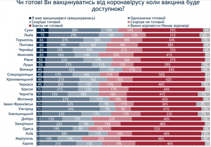 При цьому 7% опитаних у Сумах та Львові уже вакцинувалися. У Тернополі, Полтаві, Чернівцях та Миколаєві вакцинувалися 6% опитаних.