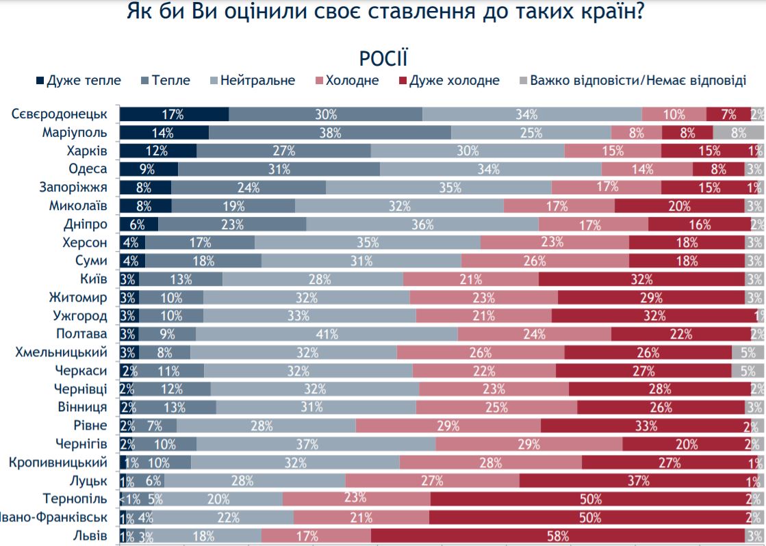 Найбільш тепло до Росії в Україні ставляться у Сєвєродонецьку, Маріуполі, Одесі, Харкові, а найбільш вороже у Львові.