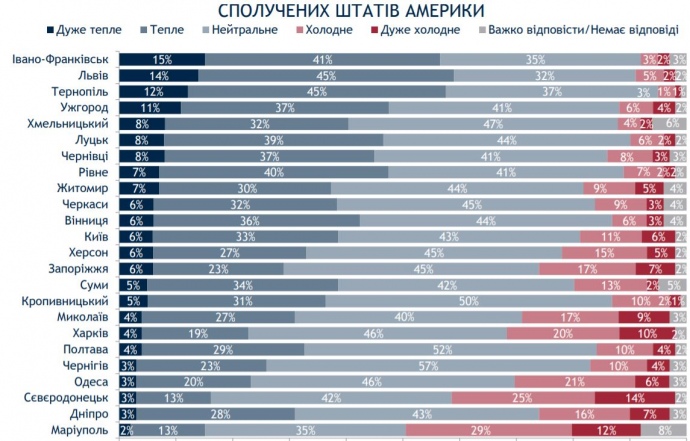 Водночас, до США в Україні прихильніше ставляться на заході країни. Зокрема, Івано-Франківську, Львові, Тернополі, Ужгороді, Луцьку.