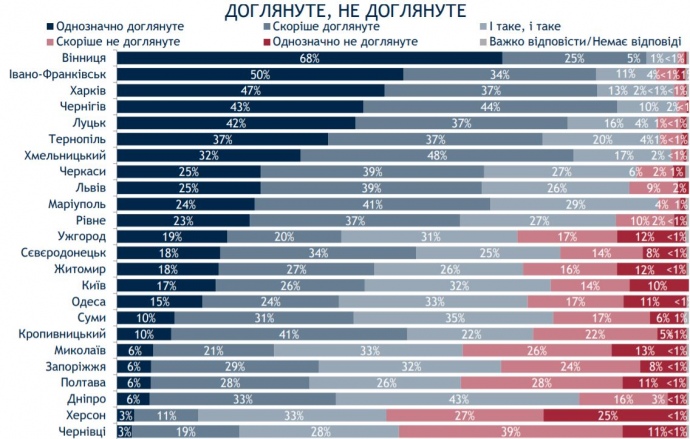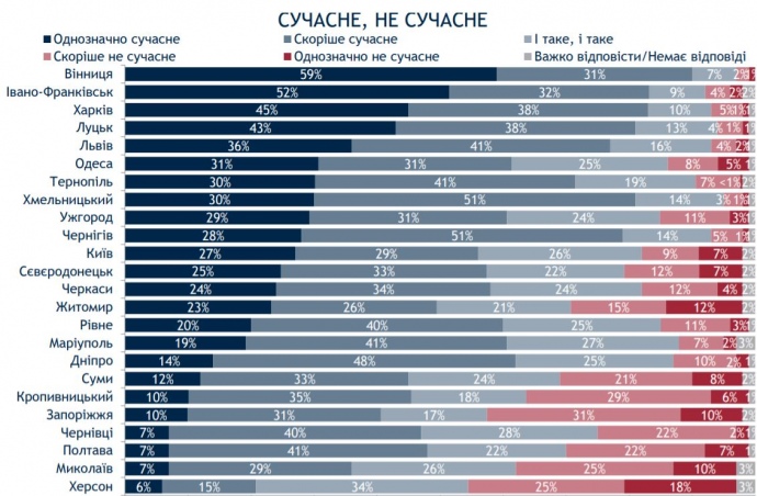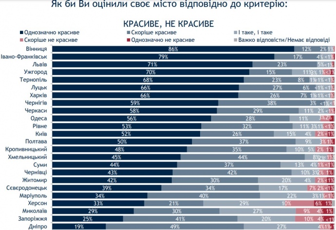 Крім того, вінничани більше за інших вважають своє місто красивим. При цьому найменше своє місто подобається мешканцям Херсона, Дніпра, Миколаєва та Запоріжжя.