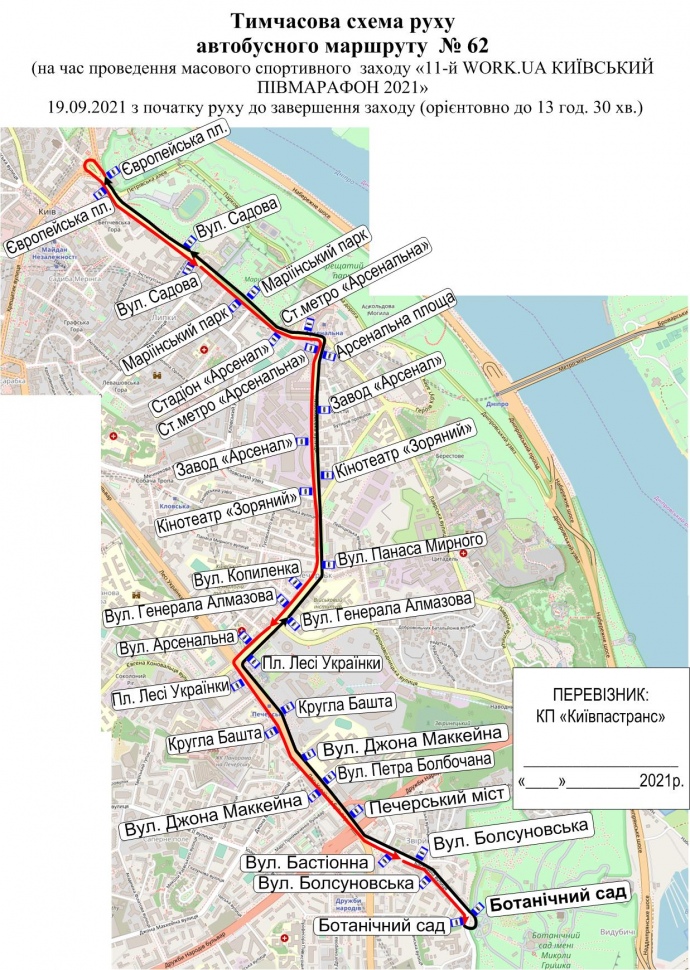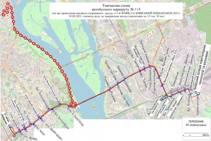 Деталі: У зв’язку з проведенням масового спортивного заходу ""11-й WORK.UA Київський пiвмарафон 2021" буде внесено зміни в маршрути автобусів №№ 62, 114, 115 та тролейбусів №№ 29, 30, 31, 47.