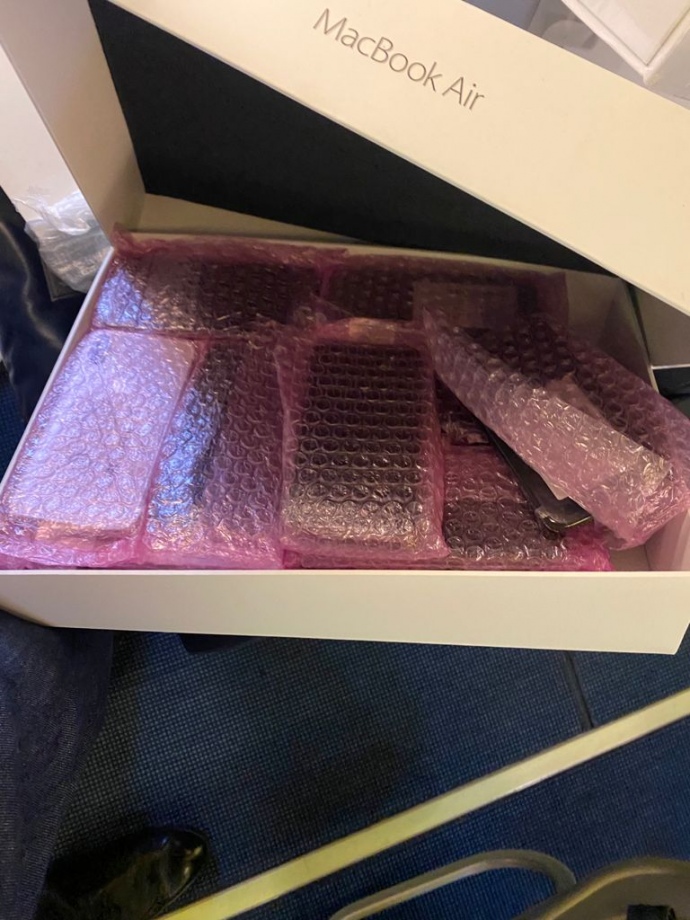 За результатами огляду літака, що прибув в аеропорт Борисполя з Дубай, виявили 85 девайсів марки Apple. Серед них: iPhone 12 Pro Max, iPhone XS, iPhone XR, One Plus Nord, MacBook Pro.