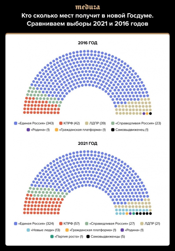 У порівнянні з виборами 2016 року, КПРФ і "Справедлива Росія" збільшили розмір своїх фракцій, ЛДПР і "Єдина Росія" - зменшили.