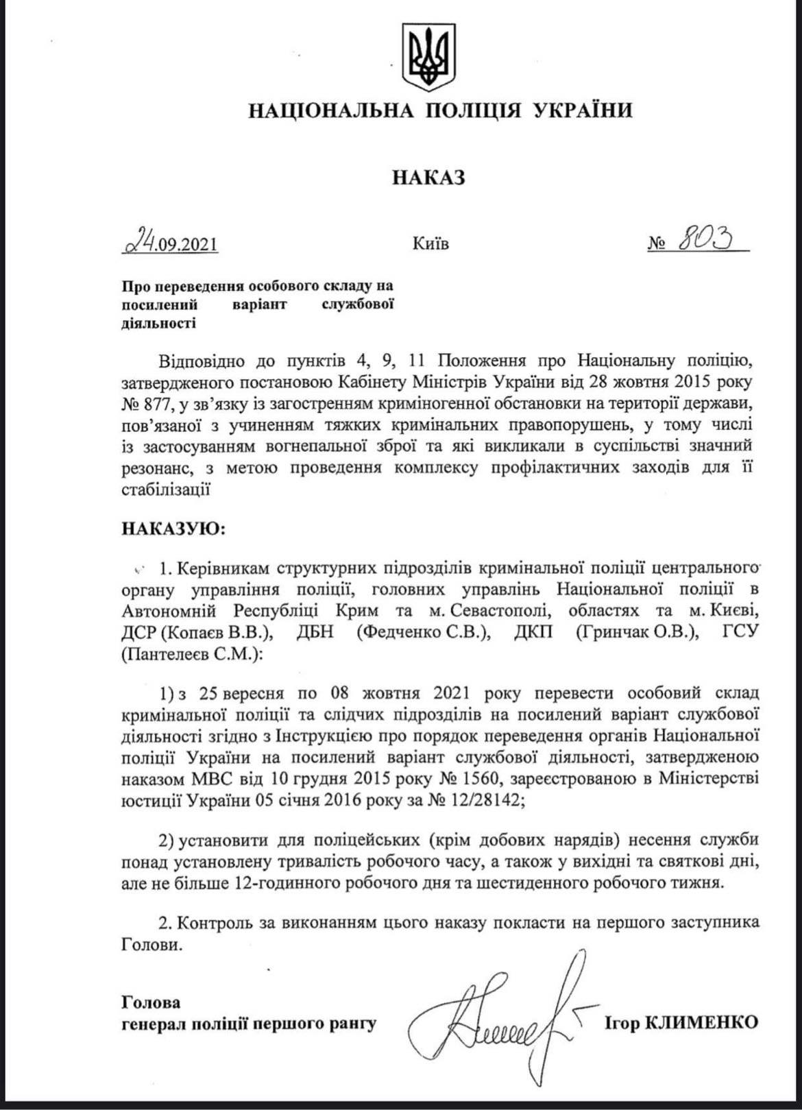Тим часом УП отримала документ, згідно з яким глава Нацполіції Ігор Клименко наказує з 25 вересня по 8 жовтня перевести особовий склад кримінальної поліції та слідчих підрозділів на посилений режим роботи "у зв'язку із загостренням криміногенної обстановки на території держави, пов'язаної з учиненням тяжких кримінальних правопорушень, у тому числі із застосуванням вогнепальної зброї, та які викликали в суспільстві значний резонанс, з метою проведення профілактичних заходів для її стабілізації".