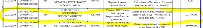 Виявилось, що ТОВ "Гудмедіа" отримало 1,23 млн грн за послуги з організації та проведення корпоративних заходів партії "Слуга Народу" та її регіональних організацій організацій.