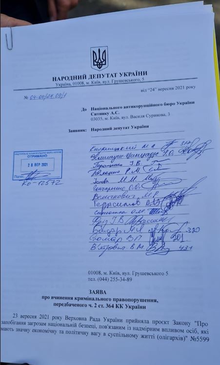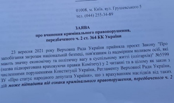 Фракція "Європейська солідарність" подала заяви до НАБУ, ОГП і ДБР через нібито вчинення кримінального правопорушення при голосуванні за закон про олігархів.