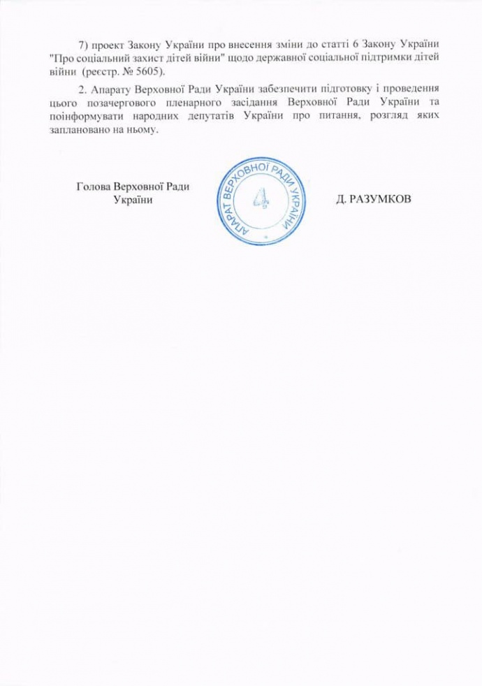 Дослівно: "Голова Верховної Ради Дмитро Разумков підписав розпорядження про проведення позачергового засідання у четвер, 07 жовтня о 16:00, на вимогу 153 народних депутатів".