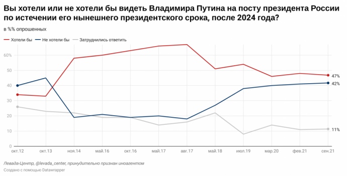 42% росіян не хотіли би бачити Володимира Путіна на посаді президента після 2024 року – це найвищий показник з 2013 року. Хотіли би бачити Путіна президентом 47% опитаних.