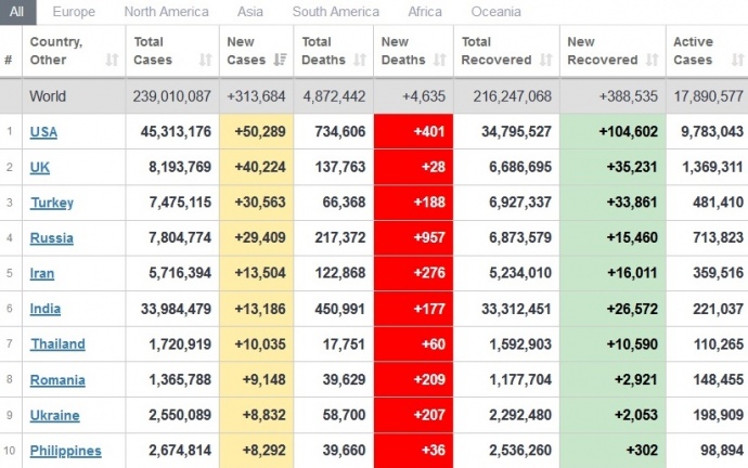 З початку пандемії підтверджено 4 872 442 смерті від COVID-19.