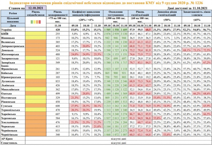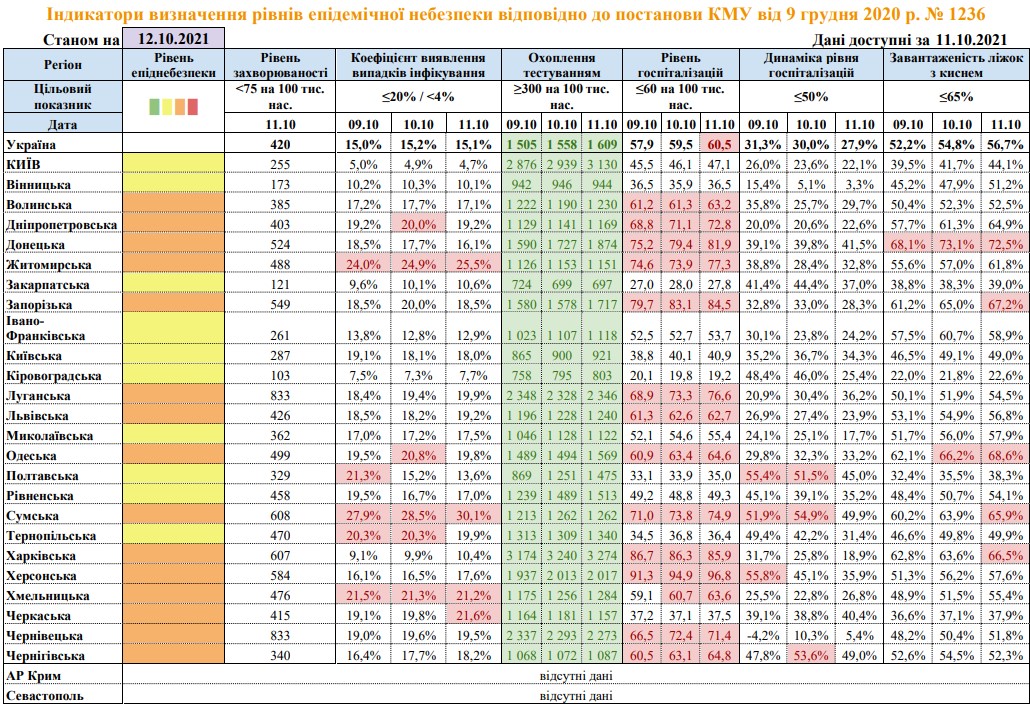 Станом на 12 жовтня, МОЗ відносить до "помаранчевої" зони епідемічної небезпеки 15 регіонів України.