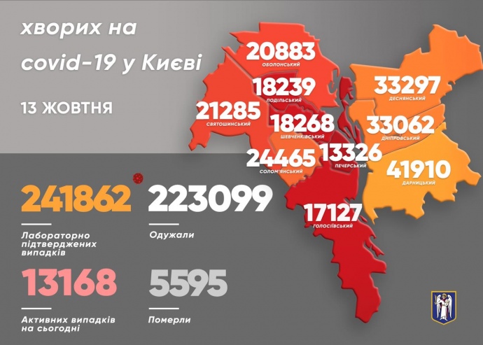 Станом на 13 жовтня в Києві підтвердили 978 випадків захворювання на коронавірус (загалом 241 862).