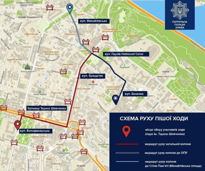 У центрі Києва 14 жовтня буде перекрито ряд центральних вулиць у зв'язку з проведенням пішої ходи, присвяченій Дню захисників і захисниць України.