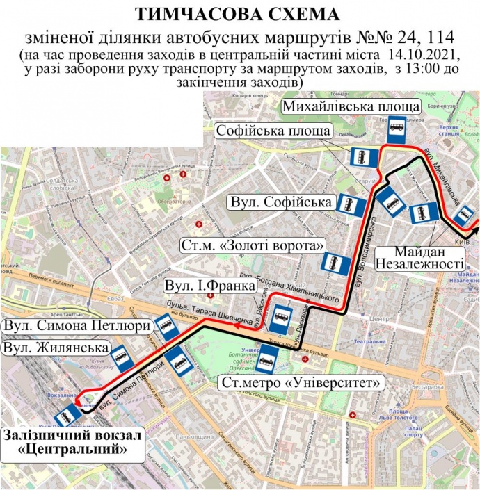 - автобуси №№ 24, 114 – відповідно від Національного музею історії України в II світовій війні та вул. Милославської до вул. Хрещатик за діючими маршрутами, далі – вул. Михайлівська – вул. Велика Житомирська – вул. Володимирська – вул. Богдана Хмельницького – вул. Пирогова – б-р Тараса Шевченка – вул. Симона Петлюри – залізничний вокзал "Центральний" – вул. Симона Петлюри – б-р. Тараса Шевченка –вул. Леонтовича – вул. Богдана Хмельницького – вул. Володимирська, далі за діючими маршрутами";