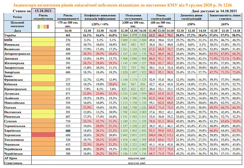 - Станом на 14 жовтня Житомирська, Дніпропетровська, Донецька, Запорізька та Харківська області перебували на межі з "червоною" зоною епідемічної небезпеки.
