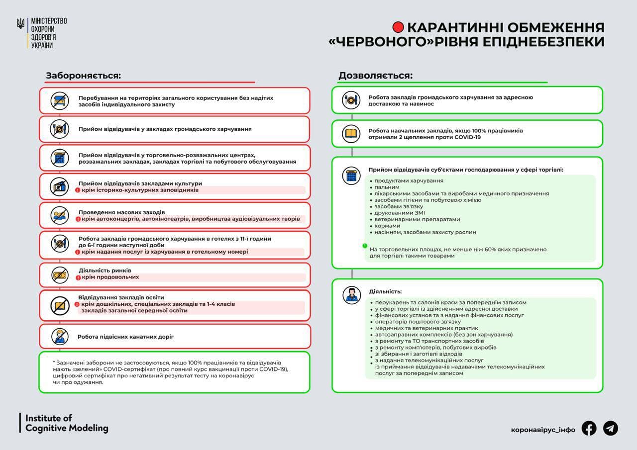 За даними сайту МОЗ, у разі введення "червоного" рівня епіднебезпеки заклади освіти працюватимуть лише якщо 100% працівників мають "зелений" COVID-сертифікат.