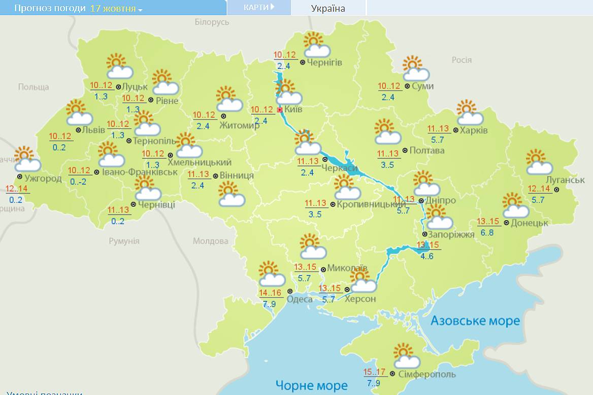 Деталі: 17 жовтня в більшості західних і північних областей вночі та вранці туман. Вітер переважно північно-західний, 5-10 м/с.