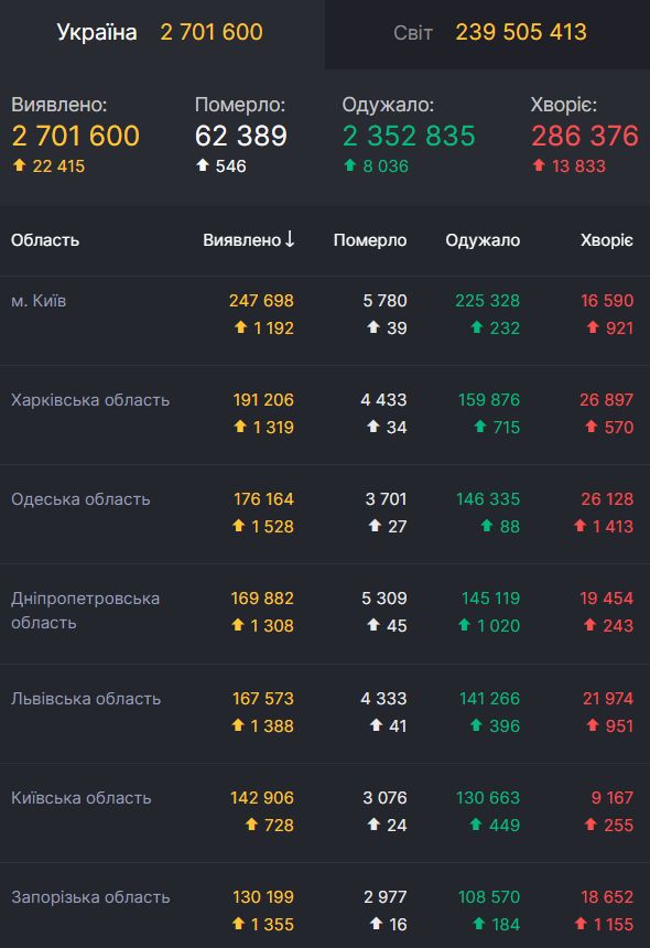 За весь час пандемії в Україні коронавірус виявили у 2 701 600 осіб, із них 2 352 835 осіб одужали, а 62 389 осіб померли.