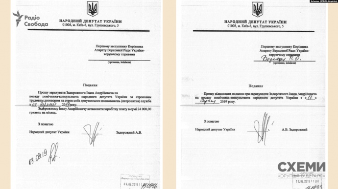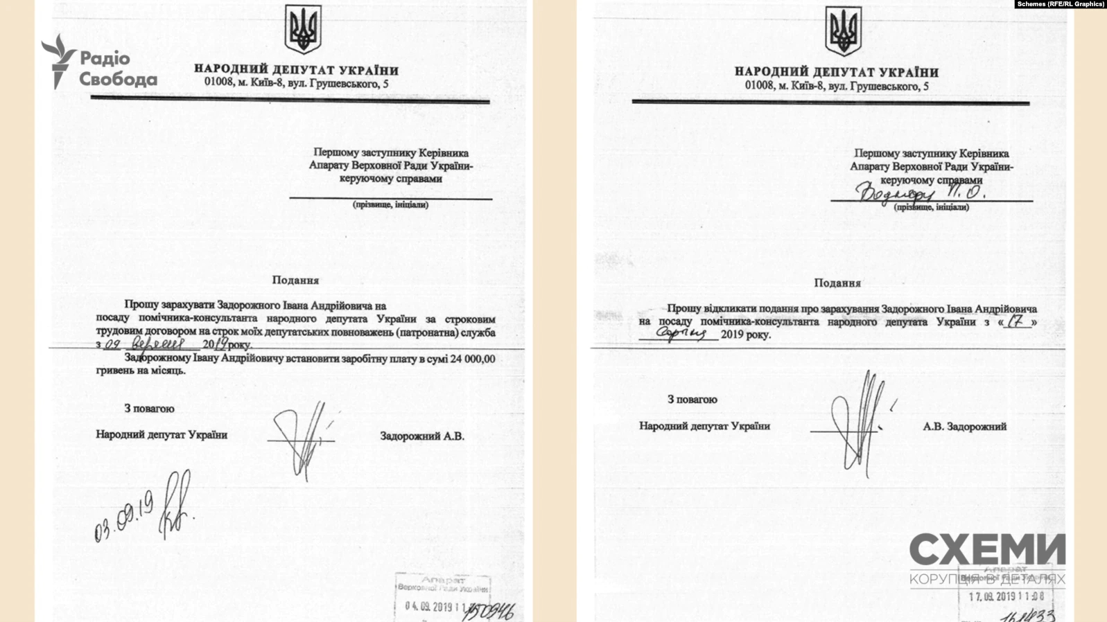 Спочатку Задорожний хотів оформити його помічником до себе та попросив встановити для свого сина зарплату у 24 тисячі гривень. Однак уже за два тижні відкликав його, і того ж дня Іван почав працювати помічником у колеги свого батька – "слуги" Андрія Костіна.