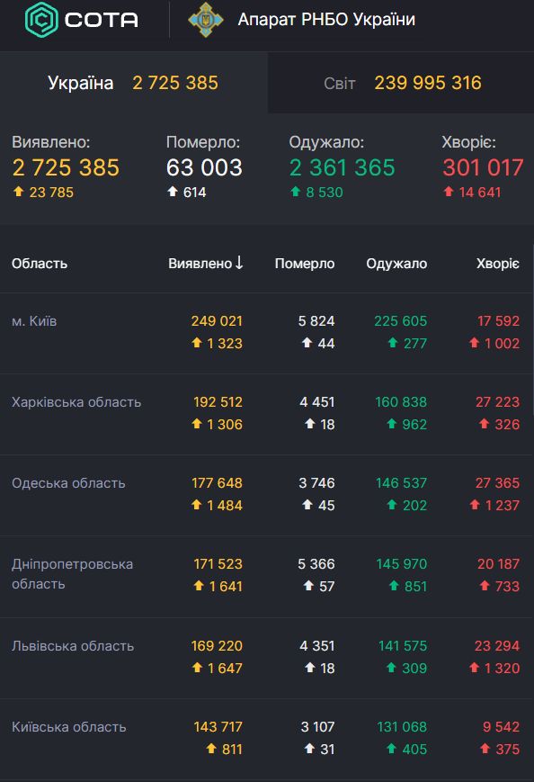 За добу 21 жовтня в Україні зафіксували 23 785 випадків коронавірусної хвороби і 614 летальних випадків від неї, госпіталізували з Covid-19 чи підозрою на нього 5 141 особу, одужали 8 530 осіб.