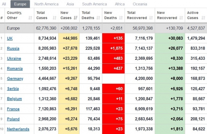 В Європі за добовим приростом хвороби лідирують Британія, Росія і Україна.
