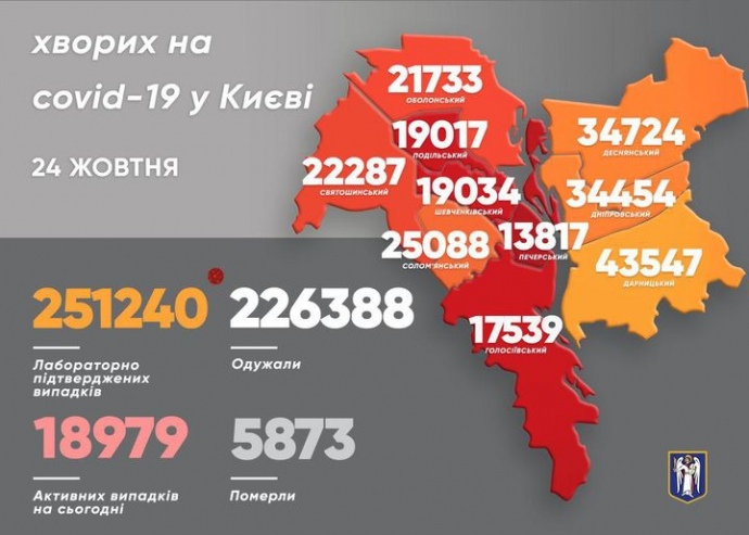 З початку пандемії у Києві виявили 251 240 випадків коронавірусу, померло 5873 хворих, одужало 226 388 осіб.